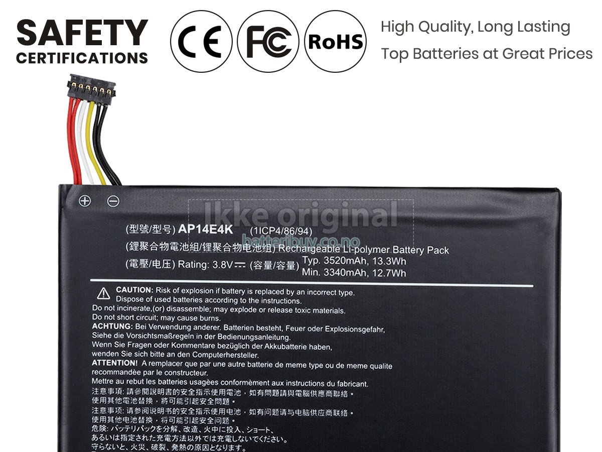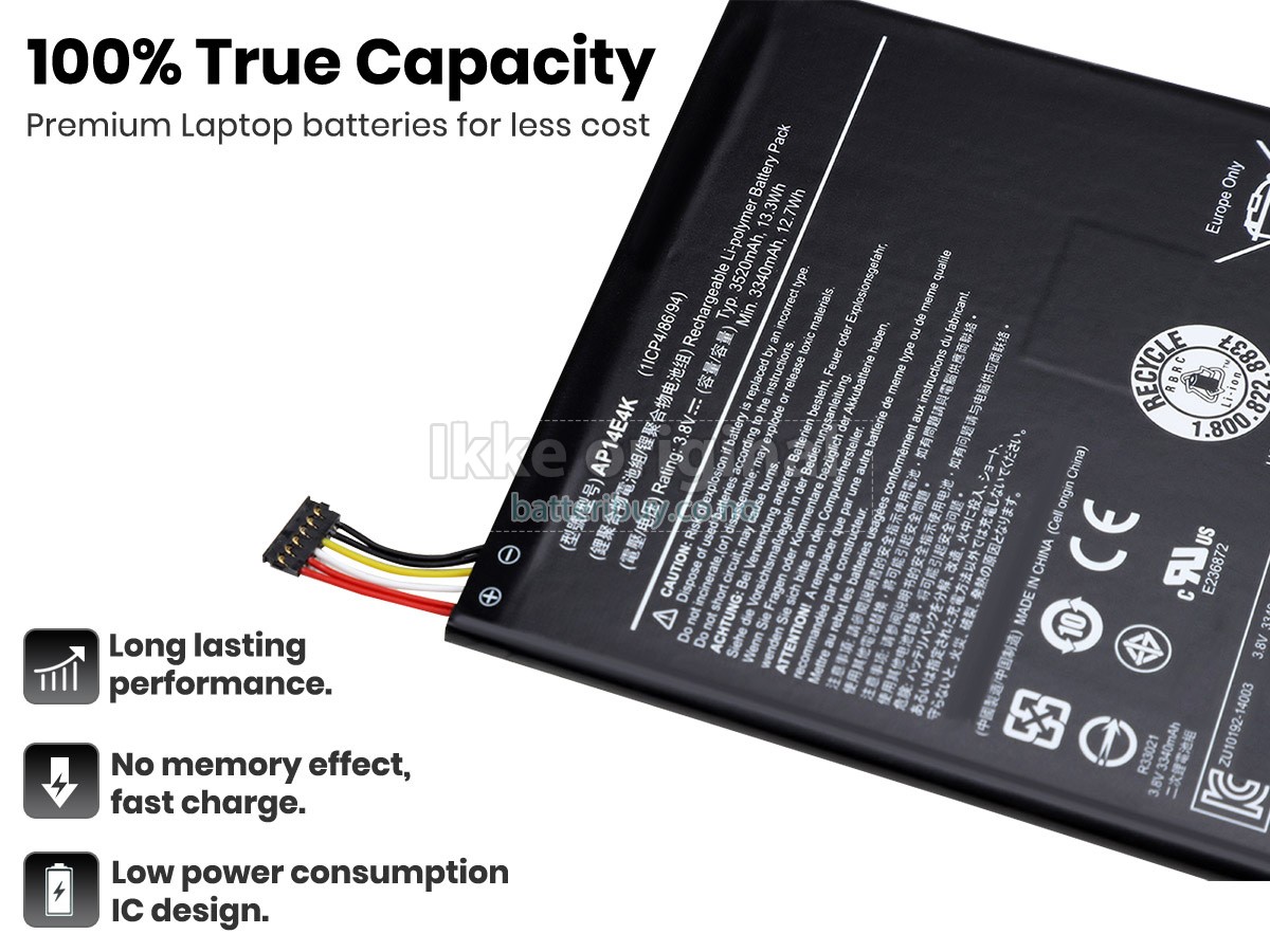 Med førsteklasses kvalitetsforsikring, batteri til Acer Iconia One 7 B1-750(NT.L65EE.003) kan beskytte av spenning, kortslutning, ladetid og ESD osv. Hvert Acer Iconia One 7 B1-750(NT.L65EE.003) laptop batteri has bestått en mengde sikkerhetssertifiseringer, som CE, UL, ROHS, ISO9001/9002. Det vil bli testet grundig av teknikerne våre før det sendes til dine hender. Vi vil prøve vårt beste for å velge et høykvalitets batteri til Acer Iconia One 7 B1-750(NT.L65EE.003) laptop.