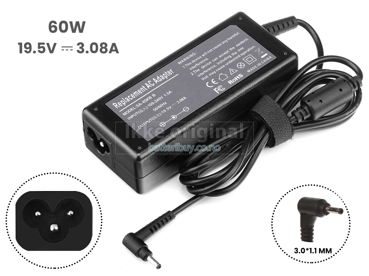 Adapter til Asus 19.5V 3.08A 60W 3.0*1.1MM (60W, Black Tip, 3.0*1.1mm)