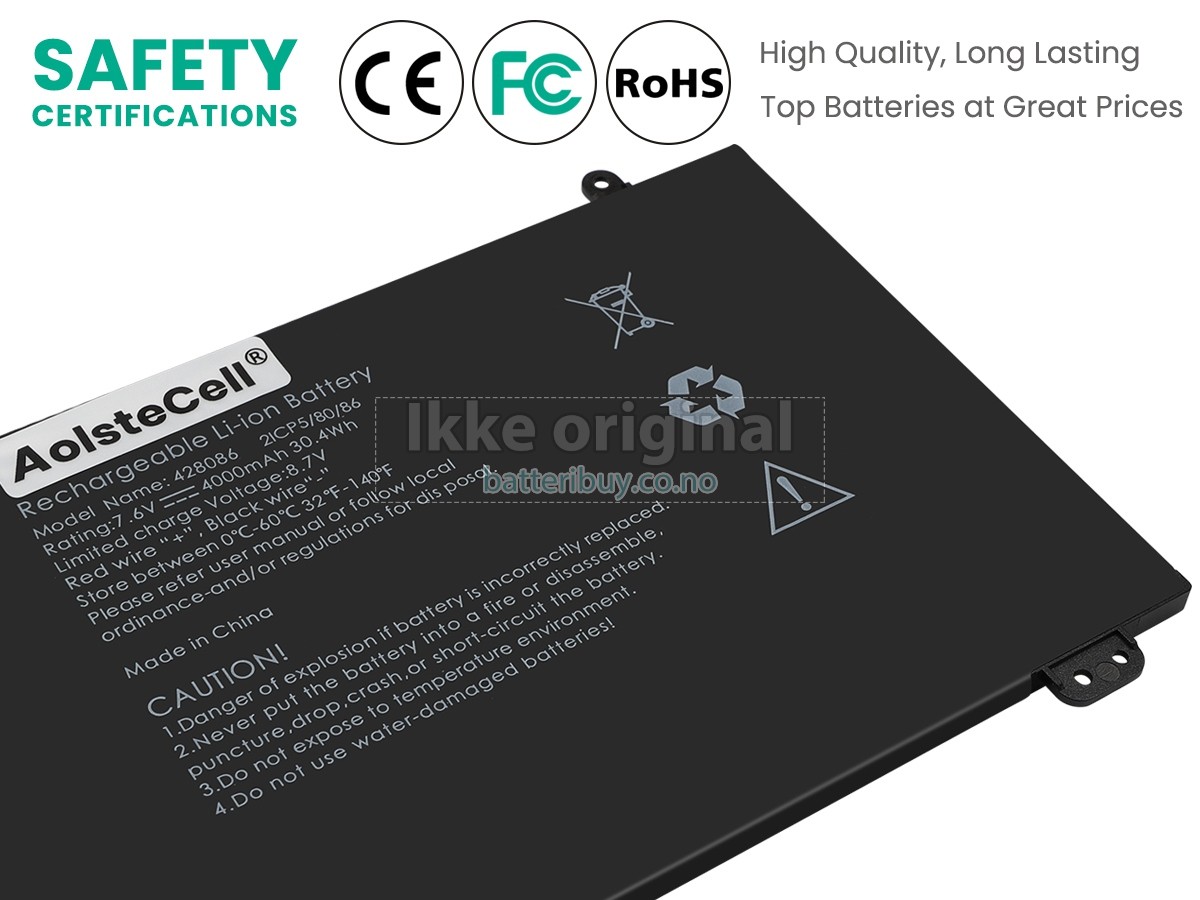 Med førsteklasses kvalitetsforsikring, batteri til AolsteCell 428086 kan beskytte av spenning, kortslutning, ladetid og ESD osv. Hvert AolsteCell 428086 laptop batteri has bestått en mengde sikkerhetssertifiseringer, som CE, UL, ROHS, ISO9001/9002. Det vil bli testet grundig av teknikerne våre før det sendes til dine hender. Vi vil prøve vårt beste for å velge et høykvalitets batteri til AolsteCell 428086 laptop.