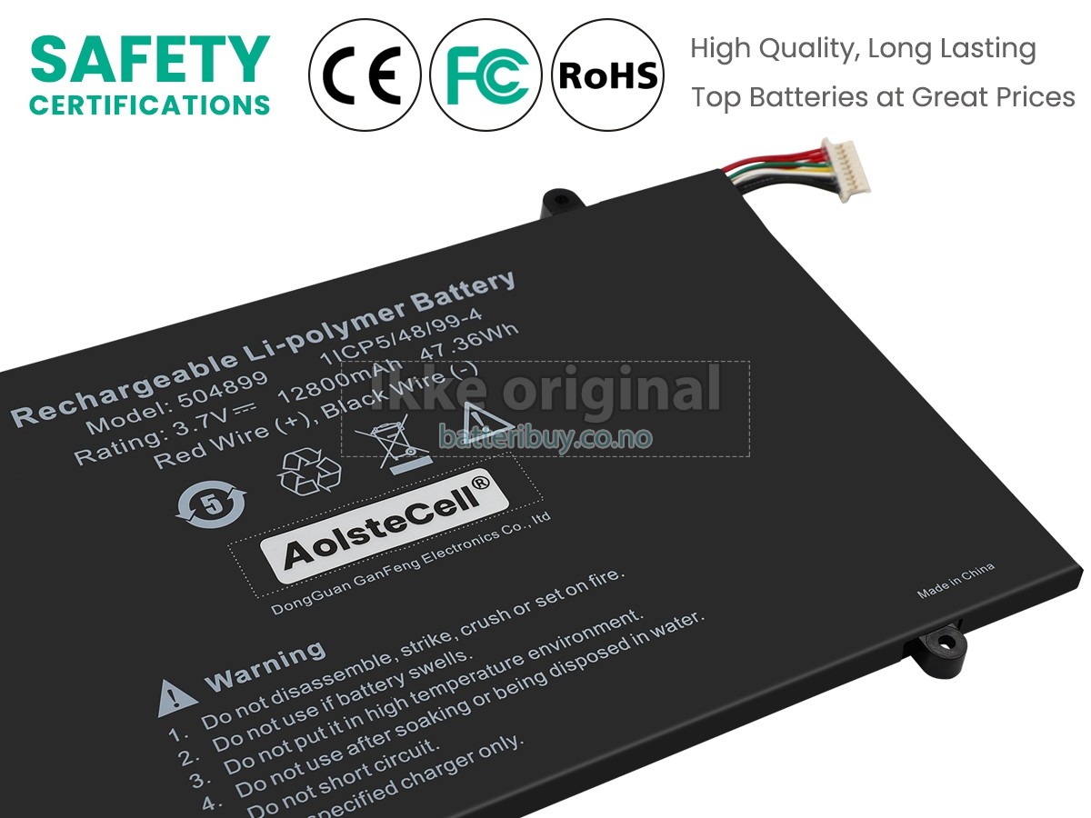 Med førsteklasses kvalitetsforsikring, batteri til AolsteCell 504899 kan beskytte av spenning, kortslutning, ladetid og ESD osv. Hvert AolsteCell 504899 laptop batteri has bestått en mengde sikkerhetssertifiseringer, som CE, UL, ROHS, ISO9001/9002. Det vil bli testet grundig av teknikerne våre før det sendes til dine hender. Vi vil prøve vårt beste for å velge et høykvalitets batteri til AolsteCell 504899 laptop.