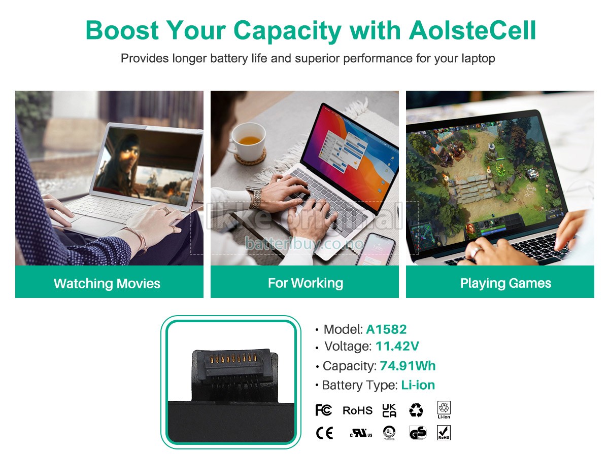 Erstatnings batteri til Apple MacBook Pro 13" Retina A1502 (2015 Year) fra BatteriBuy.co.no er ditt beste valg. Vi tilbyr høykvalitets batterier til Apple MacBook Pro 13" Retina A1502 (2015 Year) laptoper til en lavere pris. Våre Apple MacBook Pro 13" Retina A1502 (2015 Year) batterier kan lades over minst 600 sykluser. Det er laget med et ABS plastbelegg og den originale IC beskyttelseschipen, som gir deg en ny opplevelse av utmerket varighet.