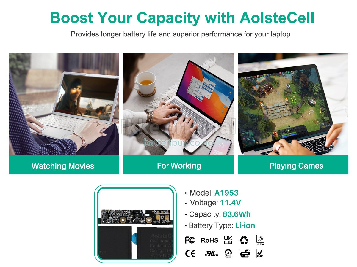Erstatnings batteri til Apple MacBook Pro Core I9 2.3G 15 inch TOUCH/2019 fra BatteriBuy.co.no er ditt beste valg. Vi tilbyr høykvalitets batterier til Apple MacBook Pro Core I9 2.3G 15 inch TOUCH/2019 laptoper til en lavere pris. Våre Apple MacBook Pro Core I9 2.3G 15 inch TOUCH/2019 batterier kan lades over minst 600 sykluser. Det er laget med et ABS plastbelegg og den originale IC beskyttelseschipen, som gir deg en ny opplevelse av utmerket varighet.
