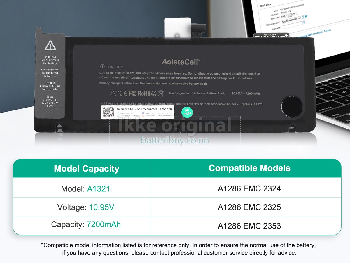 A: I produktkompatibilitetsoversikten vår, kan du sjekke om Apple MB985LL/A batteri passer til din laptop. Ved å klikke på "større bilder", Sikre på at Apple MB985LL/A batteri tilpasser til Apple datamaskinen. I tillegg, burde du sjekke om spenningen (verdien) er den samme som den gamle batteri din. For mer detaljer, kan du klikke på Hvordan finner jeg riktig batteri til laptopen min?