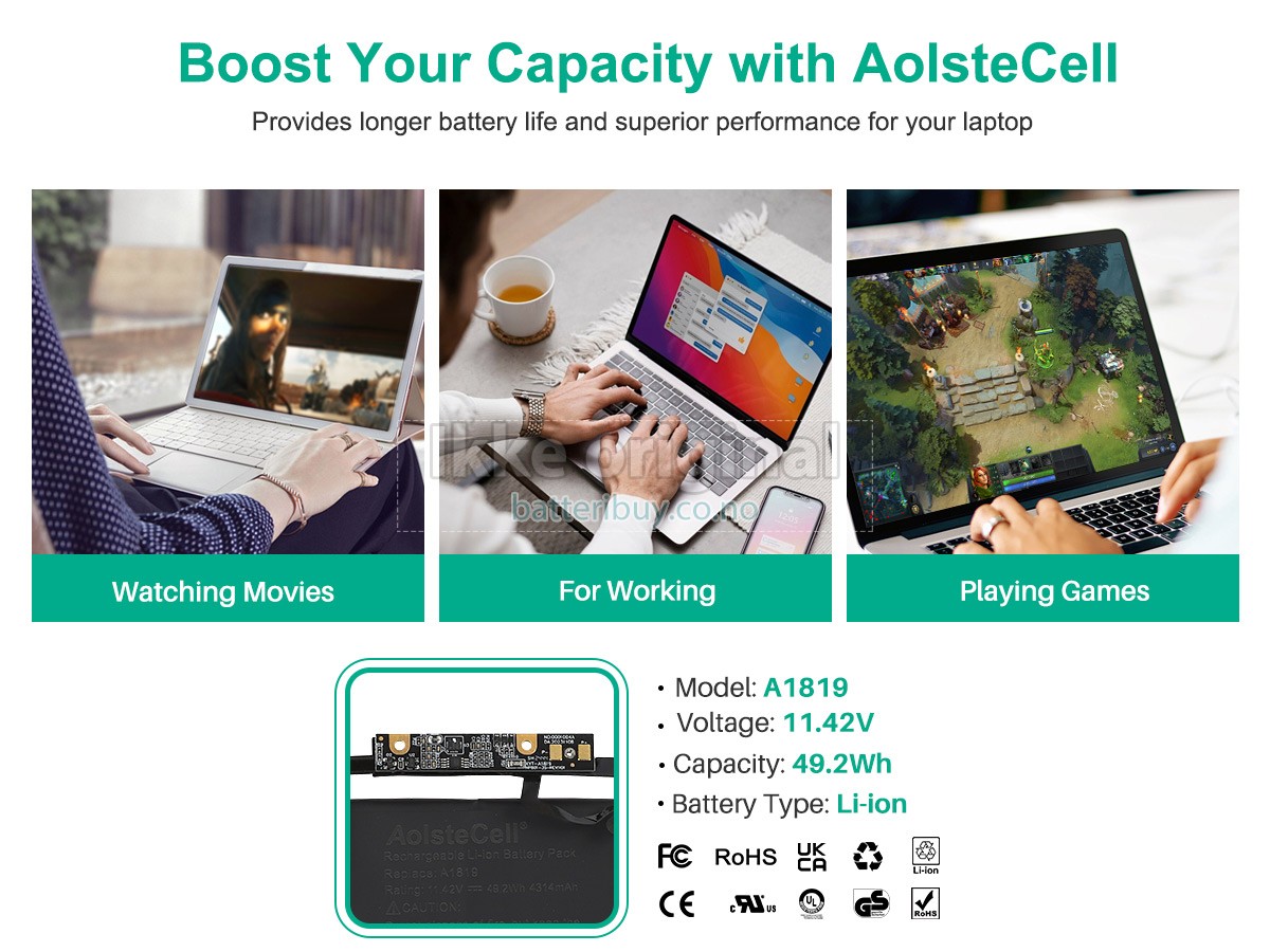 Med førsteklasses kvalitetsforsikring, batteri til Apple MLH12LL kan beskytte av spenning, kortslutning, ladetid og ESD osv. Hvert Apple MLH12LL laptop batteri has bestått en mengde sikkerhetssertifiseringer, som CE, UL, ROHS, ISO9001/9002. Det vil bli testet grundig av teknikerne våre før det sendes til dine hender. Vi vil prøve vårt beste for å velge et høykvalitets batteri til Apple MLH12LL laptop.