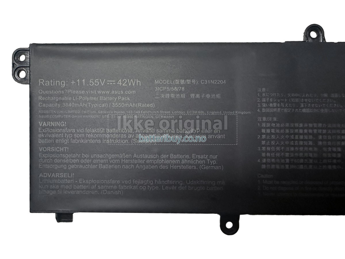 Med førsteklasses kvalitetsforsikring, batteri til Asus C31N2204 kan beskytte av spenning, kortslutning, ladetid og ESD osv. Hvert Asus C31N2204 laptop batteri has bestått en mengde sikkerhetssertifiseringer, som CE, UL, ROHS, ISO9001/9002. Det vil bli testet grundig av teknikerne våre før det sendes til dine hender. Vi vil prøve vårt beste for å velge et høykvalitets batteri til Asus C31N2204 laptop.