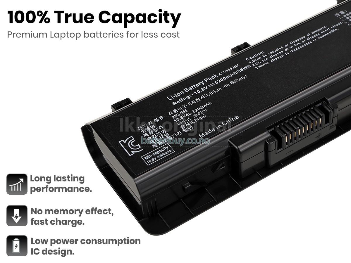 Erstatnings batteri til Asus N55E fra BatteriBuy.co.no er ditt beste valg. Vi tilbyr høykvalitets batterier til Asus N55E laptoper til en lavere pris. Våre Asus N55E batterier kan lades over minst 600 sykluser. Det er laget med et ABS plastbelegg og den originale IC beskyttelseschipen, som gir deg en ny opplevelse av utmerket varighet.