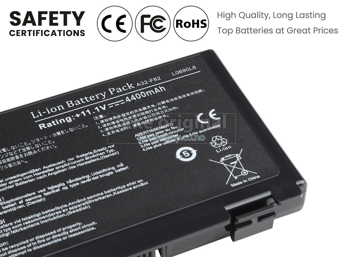 Med førsteklasses kvalitetsforsikring, batteri til Asus Pro5C kan beskytte av spenning, kortslutning, ladetid og ESD osv. Hvert Asus Pro5C laptop batteri has bestått en mengde sikkerhetssertifiseringer, som CE, UL, ROHS, ISO9001/9002. Det vil bli testet grundig av teknikerne våre før det sendes til dine hender. Vi vil prøve vårt beste for å velge et høykvalitets batteri til Asus Pro5C laptop.