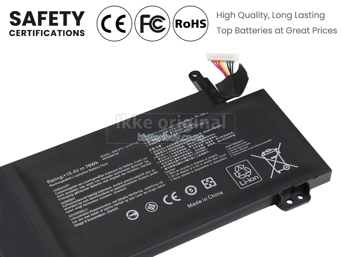 Erstatnings batteri til Asus Rog STRIX GL703GM-E5070T fra BatteriBuy.co.no er ditt beste valg. Vi tilbyr høykvalitets batterier til Asus Rog STRIX GL703GM-E5070T laptoper til en lavere pris. Våre Asus Rog STRIX GL703GM-E5070T batterier kan lades over minst 600 sykluser. Det er laget med et ABS plastbelegg og den originale IC beskyttelseschipen, som gir deg en ny opplevelse av utmerket varighet.