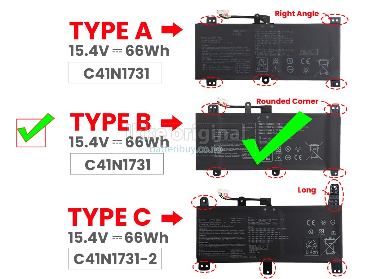 A: I produktkompatibilitetsoversikten vår, kan du sjekke om Asus Rog STRIX SCAR II G715GW-EV070T batteri passer til din laptop. Ved å klikke på "større bilder", Sikre på at Asus Rog STRIX SCAR II G715GW-EV070T batteri tilpasser til Asus datamaskinen. I tillegg, burde du sjekke om spenningen (verdien) er den samme som den gamle batteri din. For mer detaljer, kan du klikke på Hvordan finner jeg riktig batteri til laptopen min?