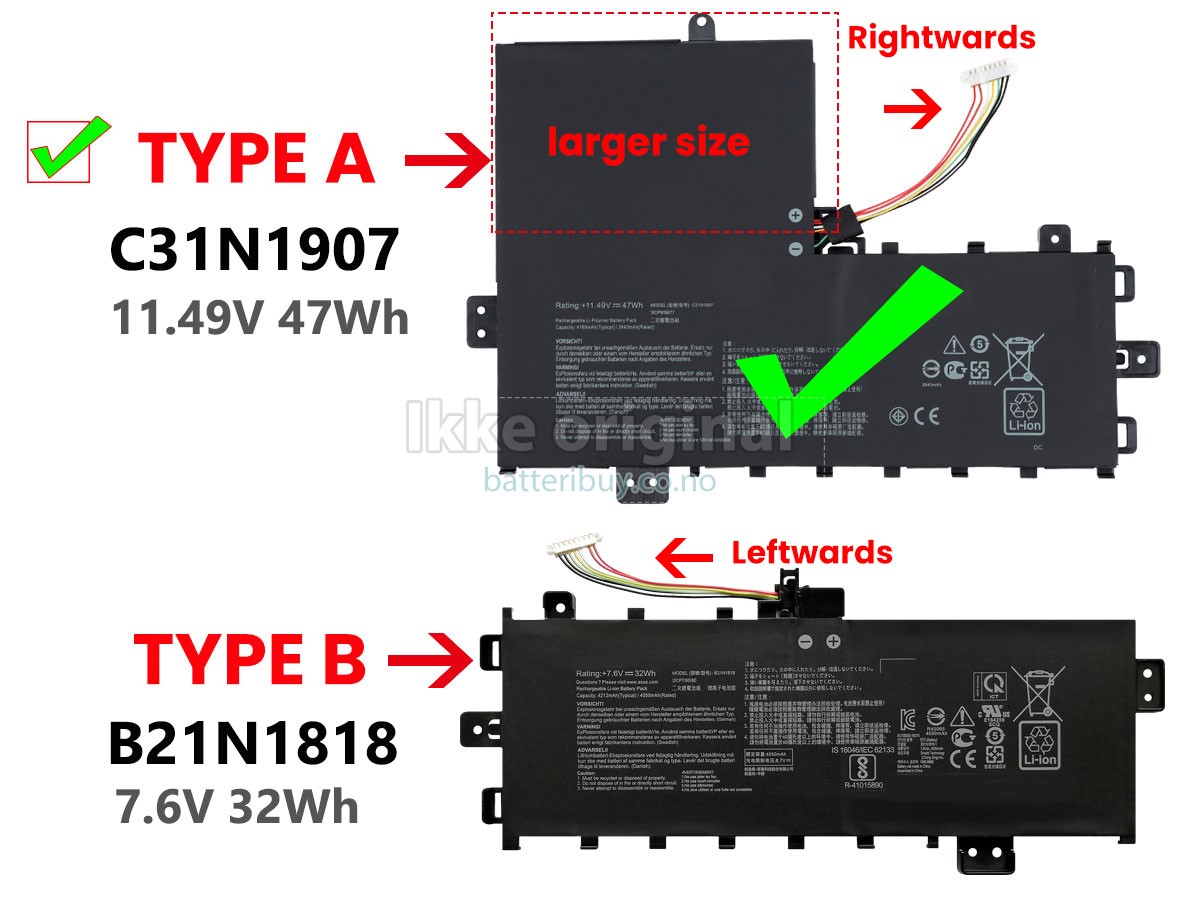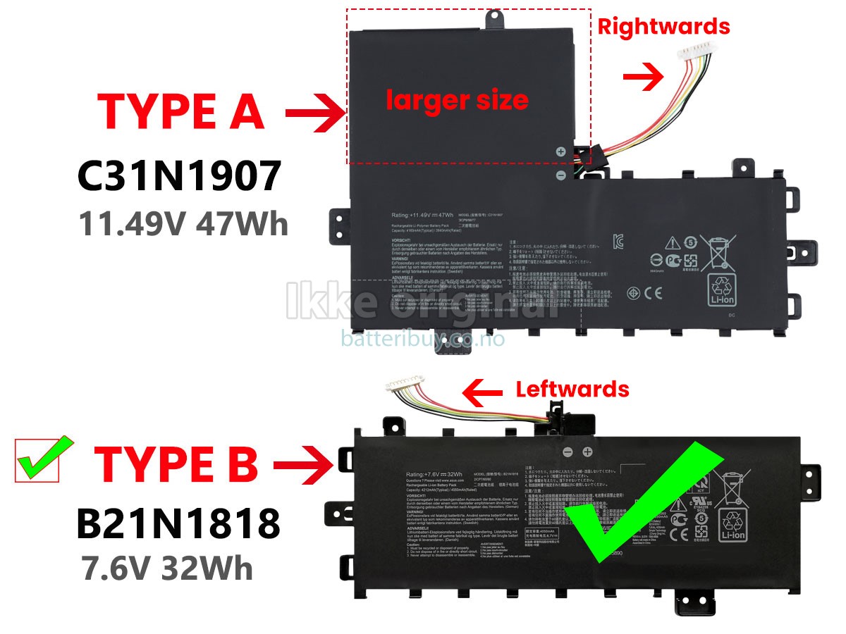 A: I produktkompatibilitetsoversikten vår, kan du sjekke om Asus VivoBook 17 M712FA batteri passer til din laptop. Ved å klikke på "større bilder", Sikre på at Asus VivoBook 17 M712FA batteri tilpasser til Asus datamaskinen. I tillegg, burde du sjekke om spenningen (verdien) er den samme som den gamle batteri din. For mer detaljer, kan du klikke på Hvordan finner jeg riktig batteri til laptopen min?