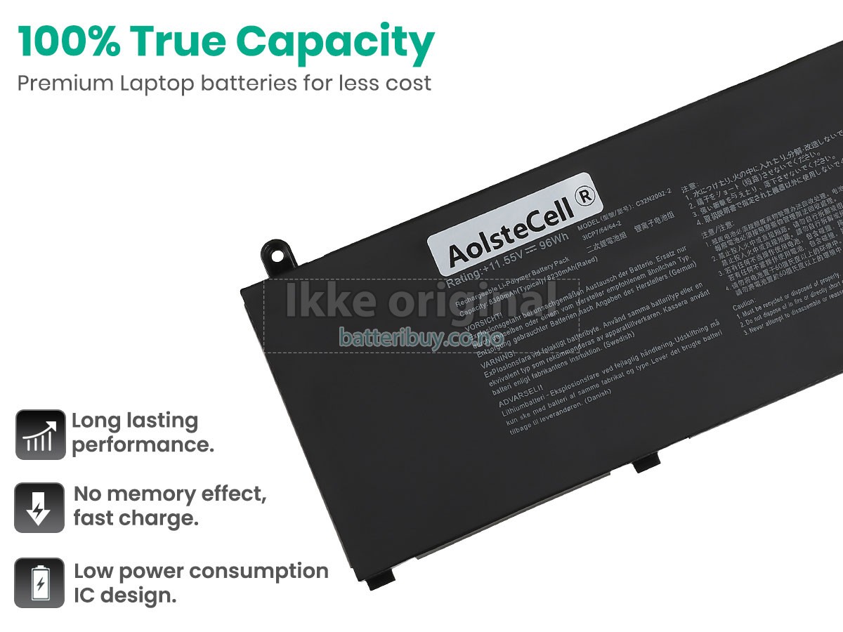 Alle våre høykvalitets erstatnings batteri til Asus ZenBook Pro 15 Flip OLED UP6502ZD laptopen kommer med ett års garanti. Garantien gjelder om kjøperen har installert batteri riktig i enheten og har behandlet batteriet på riktig måte.