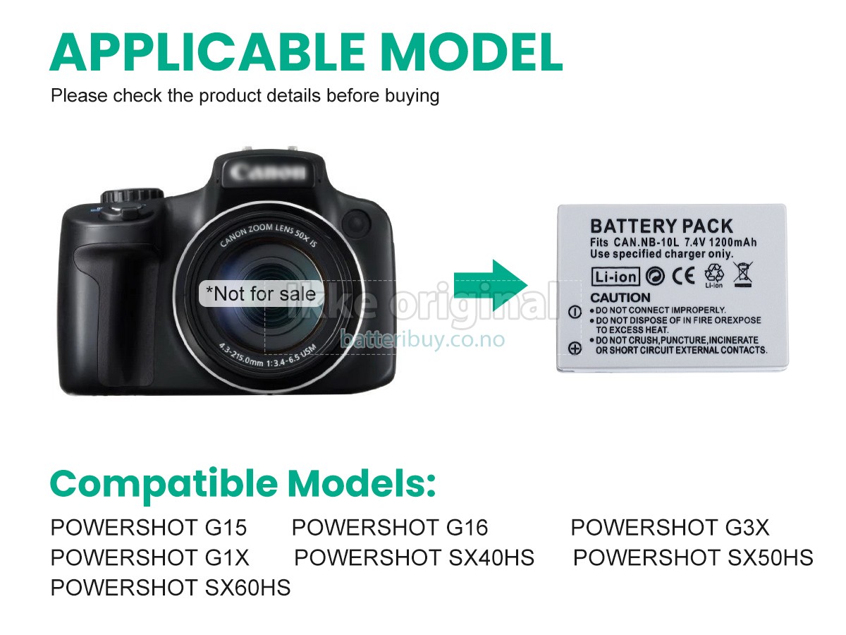 Erstatnings batteri til Canon POWERSHOT G3X fra BatteriBuy.co.no er ditt beste valg. Vi tilbyr høykvalitets batterier til Canon POWERSHOT G3X til en lavere pris. Våre Canon POWERSHOT G3X batterier kan lades over minst 600 sykluser. Det er laget med et ABS plastbelegg og den originale IC beskyttelseschipen, som gir deg en ny opplevelse av utmerket varighet.