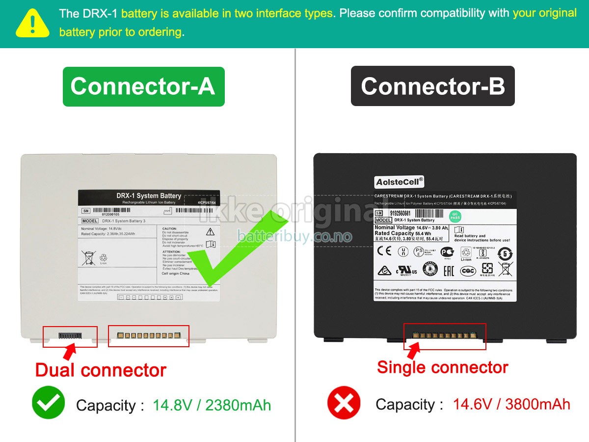 A: I produktkompatibilitetsoversikten vår, kan du sjekke om Carestream 993169 batteri passer til din. Ved å klikke på "større bilder", Sikre på at Carestream 993169 batteri tilpasser til Carestream. I tillegg, burde du sjekke om spenningen (verdien) er den samme som den gamle batteri din.
