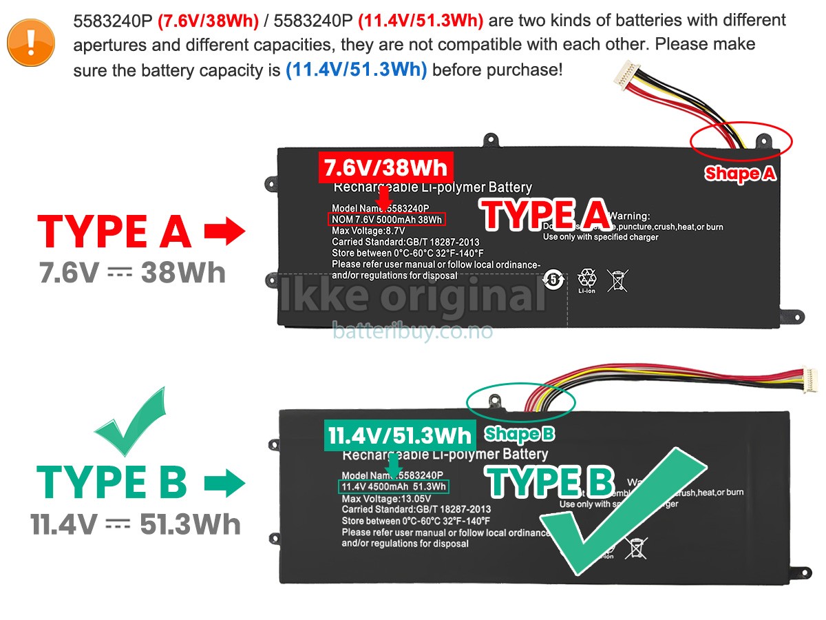 A: I produktkompatibilitetsoversikten vår, kan du sjekke om Cooyes 5583240P batteri passer til din laptop. Ved å klikke på "større bilder", Sikre på at Cooyes 5583240P batteri tilpasser til Cooyes datamaskinen. I tillegg, burde du sjekke om spenningen (verdien) er den samme som den gamle batteri din. For mer detaljer, kan du klikke på Hvordan finner jeg riktig batteri til laptopen min?