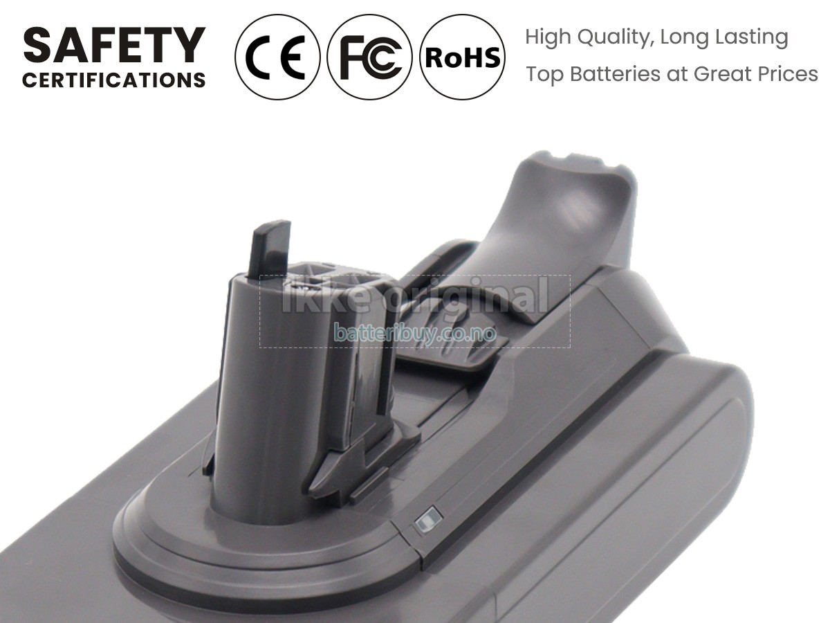 Med førsteklasses kvalitetsforsikring, batteri til Dyson V15 DETECT TOTAL CLEAN kan beskytte av spenning, kortslutning, ladetid og ESD osv. Hvert Dyson V15 DETECT TOTAL CLEAN batteri has bestått en mengde sikkerhetssertifiseringer, som CE, UL, ROHS, ISO9001/9002. Det vil bli testet grundig av teknikerne våre før det sendes til dine hender. Vi vil prøve vårt beste for å velge et høykvalitets batteri til Dyson V15 DETECT TOTAL CLEAN.