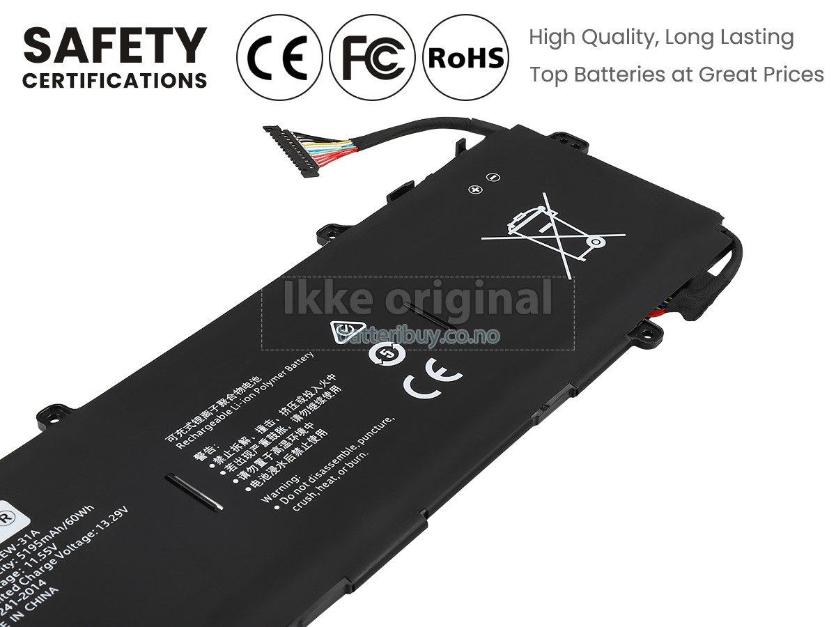 Med førsteklasses kvalitetsforsikring, batteri til Huawei MAGICBOOK VIEW 14 kan beskytte av spenning, kortslutning, ladetid og ESD osv. Hvert Huawei MAGICBOOK VIEW 14 laptop batteri has bestått en mengde sikkerhetssertifiseringer, som CE, UL, ROHS, ISO9001/9002. Det vil bli testet grundig av teknikerne våre før det sendes til dine hender. Vi vil prøve vårt beste for å velge et høykvalitets batteri til Huawei MAGICBOOK VIEW 14 laptop.