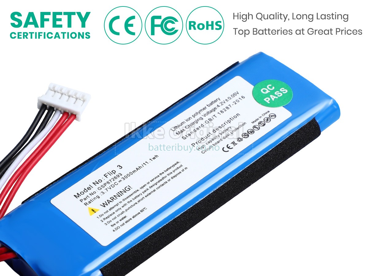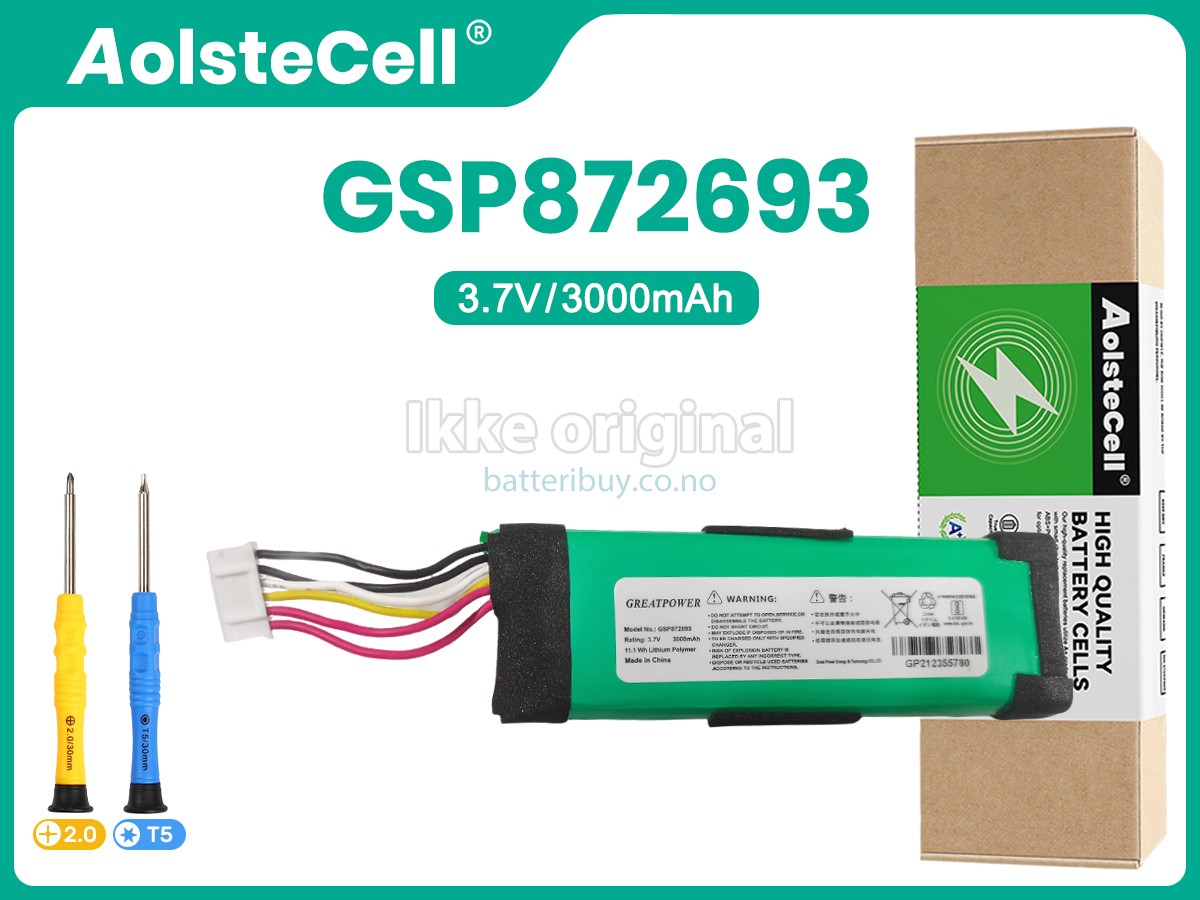 I tillegg, tilbyr vi en 30-dagers pengene tilbake garanti og en ettårsgaranti for våre JBL GSP872693 substitute batterier. Om du er misfornøyd etter å ha mottatt et batteri til JBL GSP872693, kan du klikke på linken for å finne flere detaljer om vår Returnering og Garantiservice. Vær trygg på kjøpet!