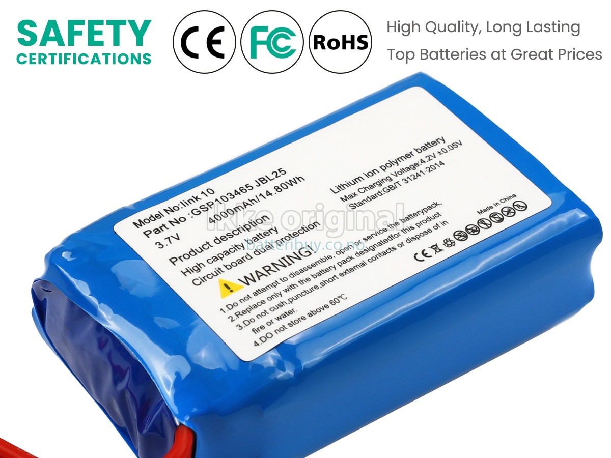 Med førsteklasses kvalitetsforsikring, batteri til JBL LINK 10 kan beskytte av spenning, kortslutning, ladetid og ESD osv. Hvert JBL LINK 10 batteri has bestått en mengde sikkerhetssertifiseringer, som CE, UL, ROHS, ISO9001/9002. Det vil bli testet grundig av teknikerne våre før det sendes til dine hender. Vi vil prøve vårt beste for å velge et høykvalitets batteri til JBL LINK 10.