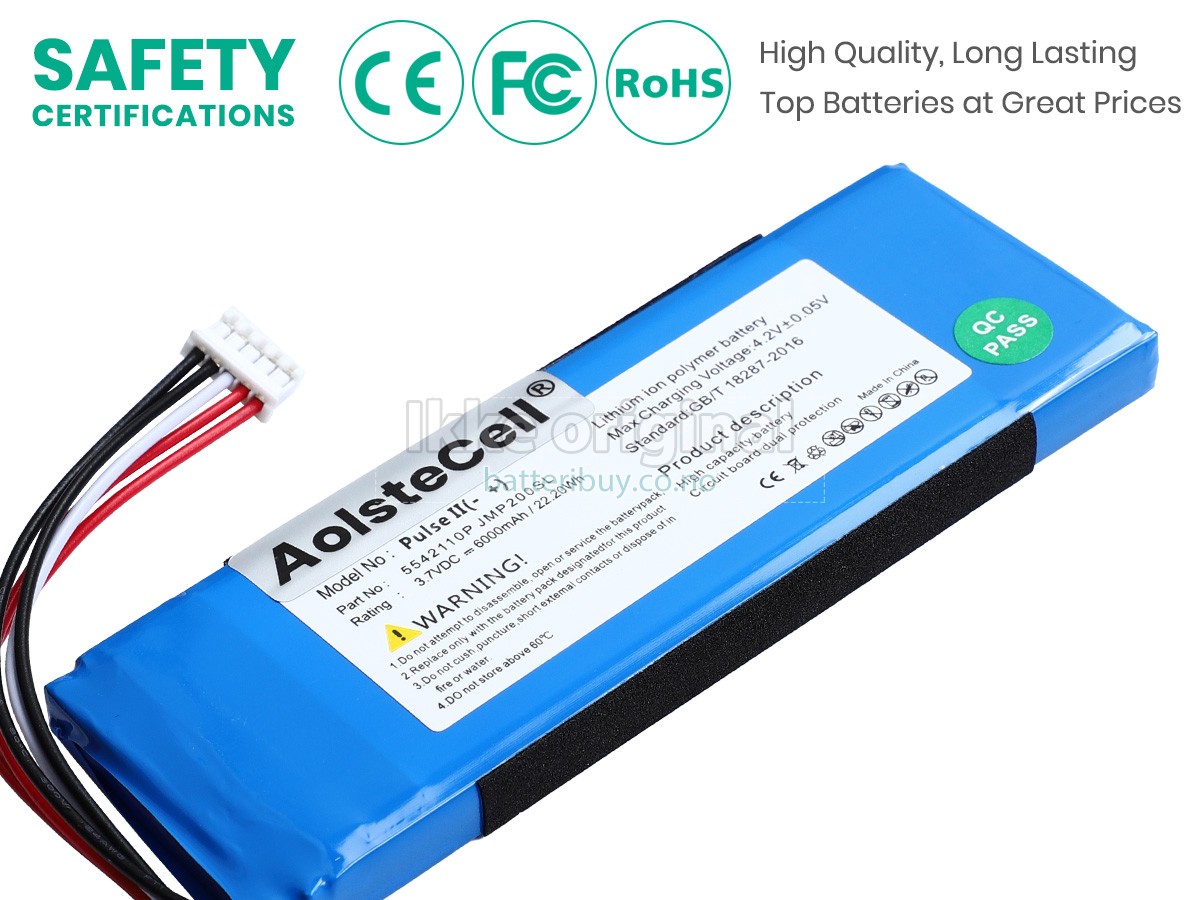 Med førsteklasses kvalitetsforsikring, batteri til JBL PULSE 2 kan beskytte av spenning, kortslutning, ladetid og ESD osv. Hvert JBL PULSE 2 batteri has bestått en mengde sikkerhetssertifiseringer, som CE, UL, ROHS, ISO9001/9002. Det vil bli testet grundig av teknikerne våre før det sendes til dine hender. Vi vil prøve vårt beste for å velge et høykvalitets batteri til JBL PULSE 2.