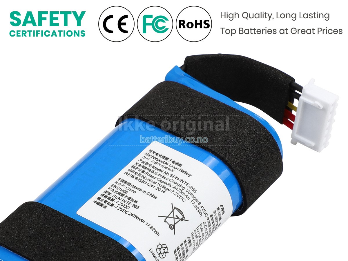 Med førsteklasses kvalitetsforsikring, batteri til JBL SUN-INTE-265Z kan beskytte av spenning, kortslutning, ladetid og ESD osv. Hvert JBL SUN-INTE-265Z batteri has bestått en mengde sikkerhetssertifiseringer, som CE, UL, ROHS, ISO9001/9002. Det vil bli testet grundig av teknikerne våre før det sendes til dine hender. Vi vil prøve vårt beste for å velge et høykvalitets batteri til JBL SUN-INTE-265Z.