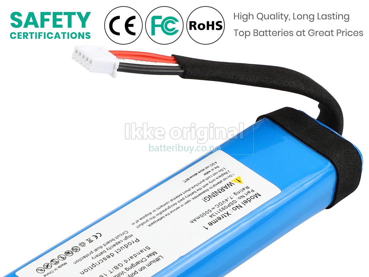 Med førsteklasses kvalitetsforsikring, batteri til JBL XTREME 1 kan beskytte av spenning, kortslutning, ladetid og ESD osv. Hvert JBL XTREME 1 batteri has bestått en mengde sikkerhetssertifiseringer, som CE, UL, ROHS, ISO9001/9002. Det vil bli testet grundig av teknikerne våre før det sendes til dine hender. Vi vil prøve vårt beste for å velge et høykvalitets batteri til JBL XTREME 1.