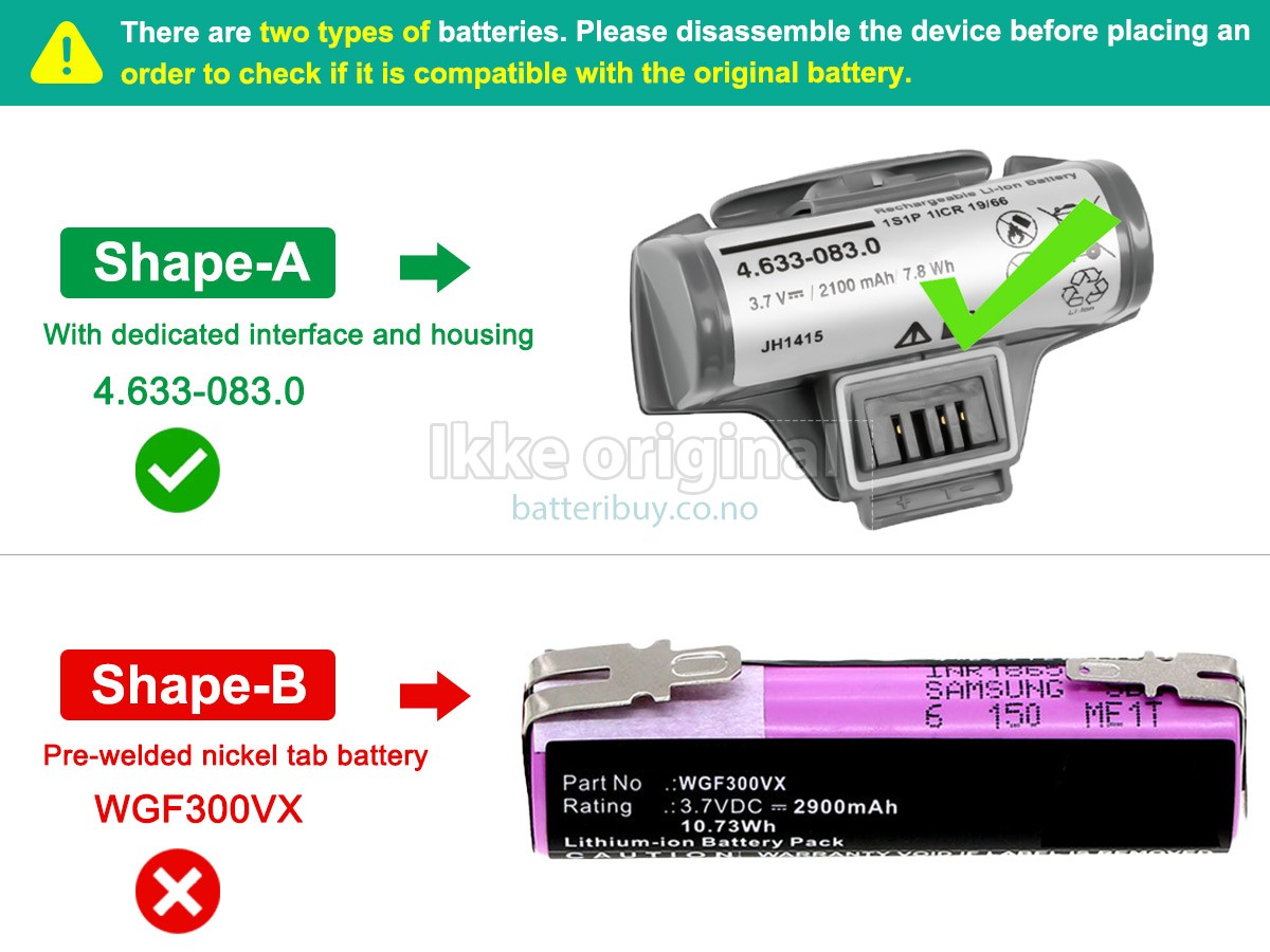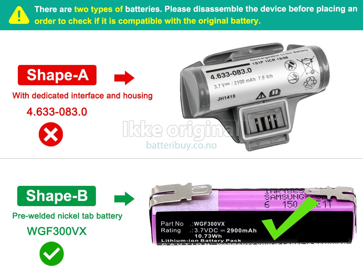 A: I produktkompatibilitetsoversikten vår, kan du sjekke om Karcher WV2 PREMIUM batteri passer til din støvsuger. Ved å klikke på "større bilder", Sikre på at Karcher WV2 PREMIUM batteri tilpasser til Karcher støvsuger. I tillegg, burde du sjekke om spenningen (verdien) er den samme som den gamle batteri din.