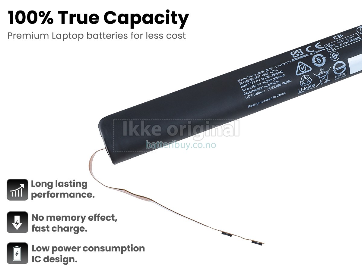 Erstatnings batteri til Lenovo L14D3K32 fra BatteriBuy.co.no er ditt beste valg. Vi tilbyr høykvalitets batterier til Lenovo L14D3K32 laptoper til en lavere pris. Våre Lenovo L14D3K32 batterier kan lades over minst 600 sykluser. Det er laget med et ABS plastbelegg og den originale IC beskyttelseschipen, som gir deg en ny opplevelse av utmerket varighet.