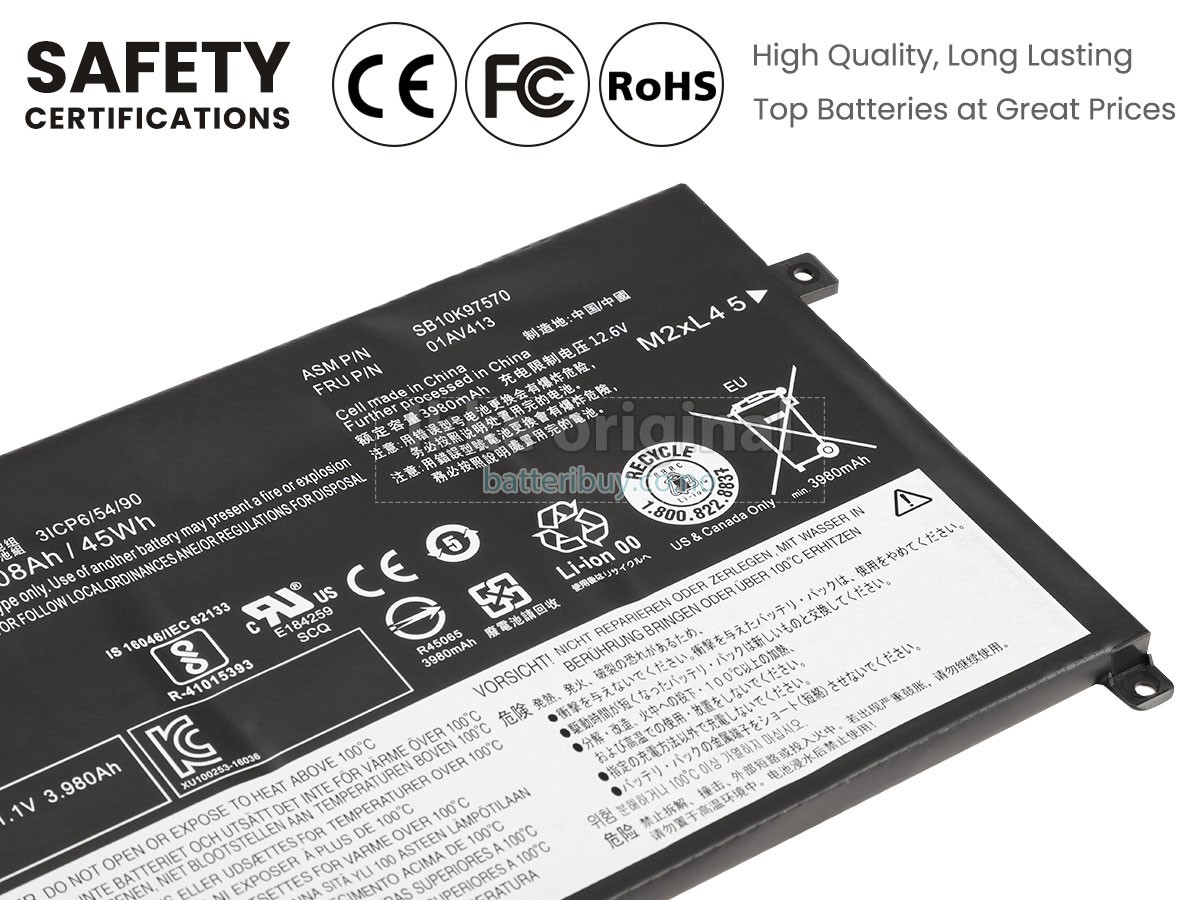 Med førsteklasses kvalitetsforsikring, batteri til Lenovo ThinkPad E470(20H2S00400) kan beskytte av spenning, kortslutning, ladetid og ESD osv. Hvert Lenovo ThinkPad E470(20H2S00400) laptop batteri has bestått en mengde sikkerhetssertifiseringer, som CE, UL, ROHS, ISO9001/9002. Det vil bli testet grundig av teknikerne våre før det sendes til dine hender. Vi vil prøve vårt beste for å velge et høykvalitets batteri til Lenovo ThinkPad E470(20H2S00400) laptop.