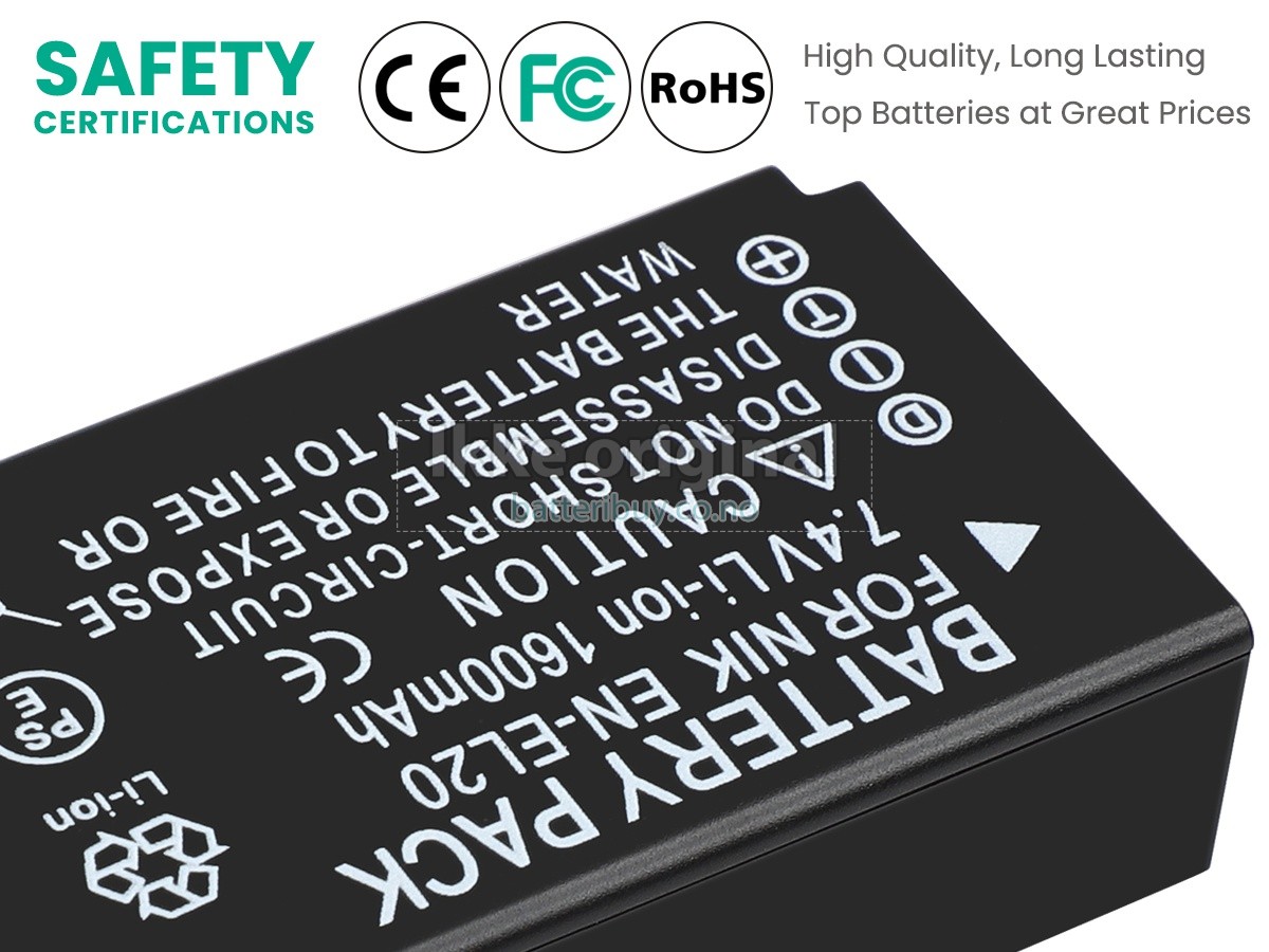 Med førsteklasses kvalitetsforsikring, batteri til Nikon EN-EL20A kan beskytte av spenning, kortslutning, ladetid og ESD osv. Hvert Nikon EN-EL20A batteri has bestått en mengde sikkerhetssertifiseringer, som CE, UL, ROHS, ISO9001/9002. Det vil bli testet grundig av teknikerne våre før det sendes til dine hender. Vi vil prøve vårt beste for å velge et høykvalitets batteri til Nikon EN-EL20A.