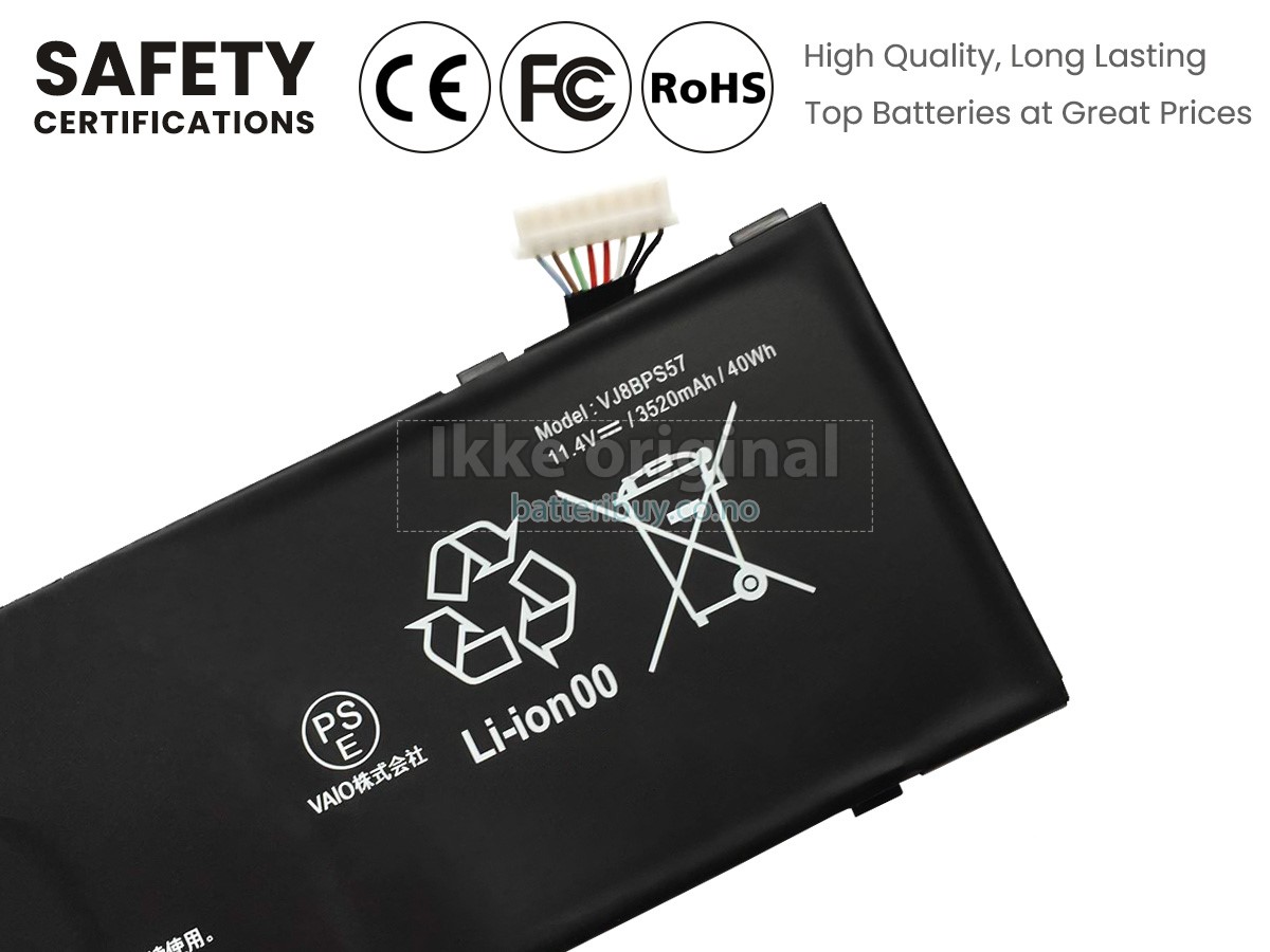 Erstatnings batteri til Sony VJ8BPS57 fra BatteriBuy.co.no er ditt beste valg. Vi tilbyr høykvalitets batterier til Sony VJ8BPS57 laptoper til en lavere pris. Våre Sony VJ8BPS57 batterier kan lades over minst 600 sykluser. Det er laget med et ABS plastbelegg og den originale IC beskyttelseschipen, som gir deg en ny opplevelse av utmerket varighet.