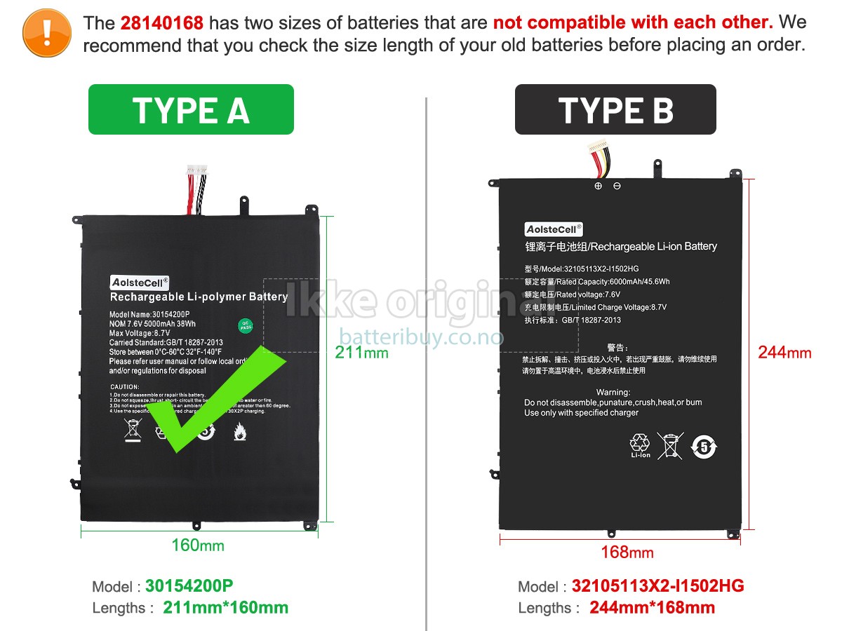 A: I produktkompatibilitetsoversikten vår, kan du sjekke om Teclast 28140168 batteri passer til din laptop. Ved å klikke på "større bilder", Sikre på at Teclast 28140168 batteri tilpasser til Teclast datamaskinen. I tillegg, burde du sjekke om spenningen (verdien) er den samme som den gamle batteri din. For mer detaljer, kan du klikke på Hvordan finner jeg riktig batteri til laptopen min?